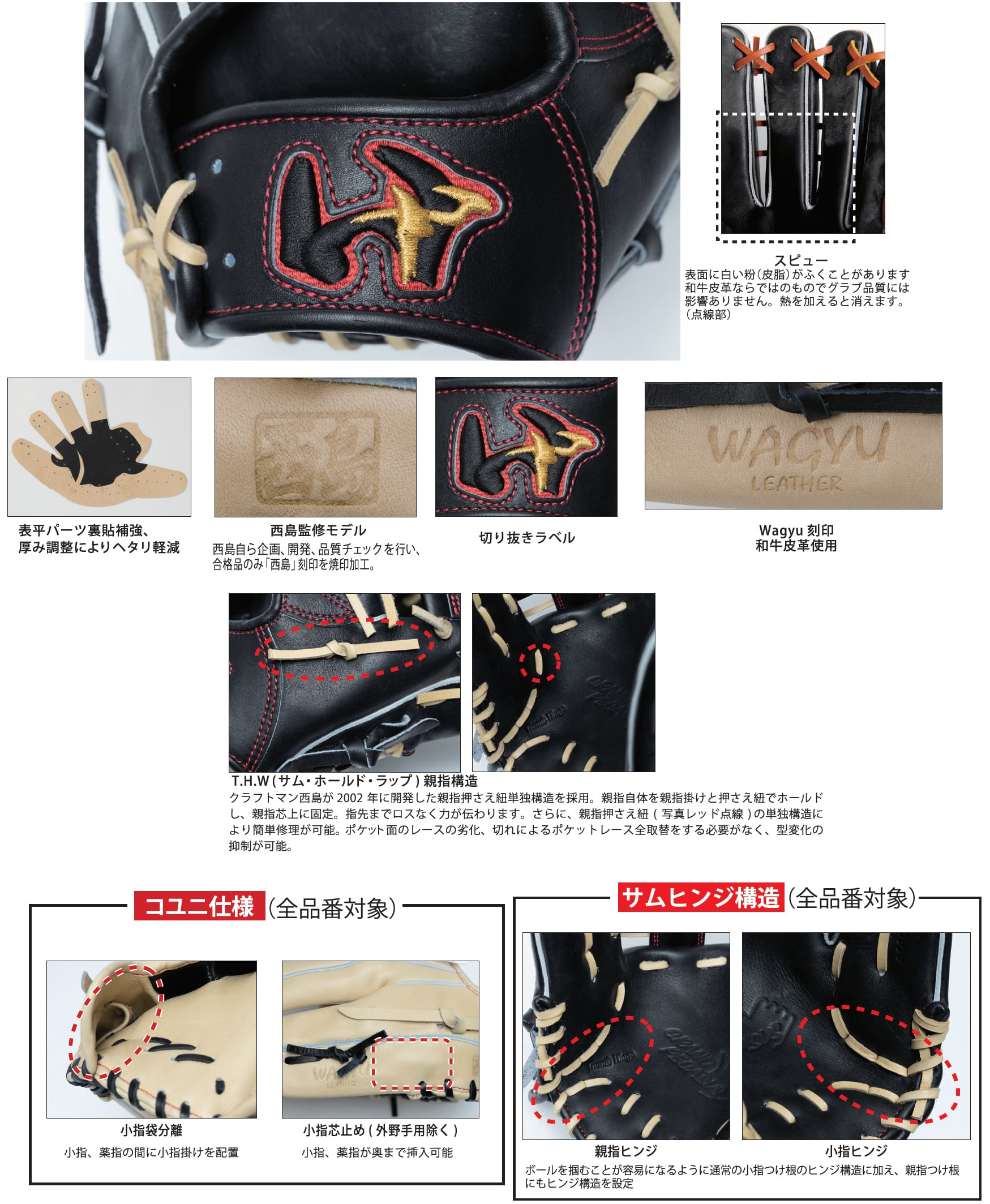 ボールを掴むことが容易になるように、通常の小指付け根のヒンジに加え、親指付け根部にもヒンジ構造を設定。